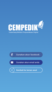 Untuk memulai menggunakan aplikasi CEMPEDIK ini, terlebih dahulu melakukan langkah seperti diatas, jika belum terdaftar dalam aplikasi CEMPEDIK maka langkah selanjutnya setelah menekan tombol connect with facebook dan connect with email makan setelah itu masuk form registrasi.
