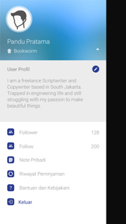 User Profile merupakan halaman user yang berisi profile singkat, status badges (level baca), Kota Tinggal, Want List, List Read, List Followers, Following. Pada user profile disediakan juga tombol follow sehingga user bisa berinteraksi dengan user lain.