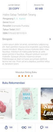 Untuk mendapatkan detail dari suatu buku, pilih salah satu cover buku yang ingin anda lihat detailnya. Setelah itu akan muncul detail informasi, yaitu judul buku, pengarang buku, ISBN, penerbit, tanggal terbit, rating buku, dan harga buku, synopsis, Want List (List yang menginginkan buku tersebut), is Read (yang sedang membaca buku tersebut), has Read (yang selesai membaca buku tersebut), review.