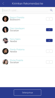 Share recommend digunakan untuk membagikan informasi buku dengan cara mengirimkan ke notifikasi user yang sudah memfollow dan di follow oleh anda.