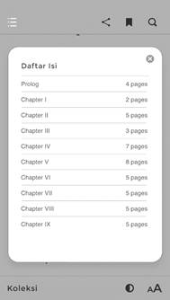 eReader merupakan fitur baca buku yang dilengkapi dengan TOC (Table Of Content), Change Font Style, Change Font Type, Line Spasing, Change Theme, Bookmark, Search.